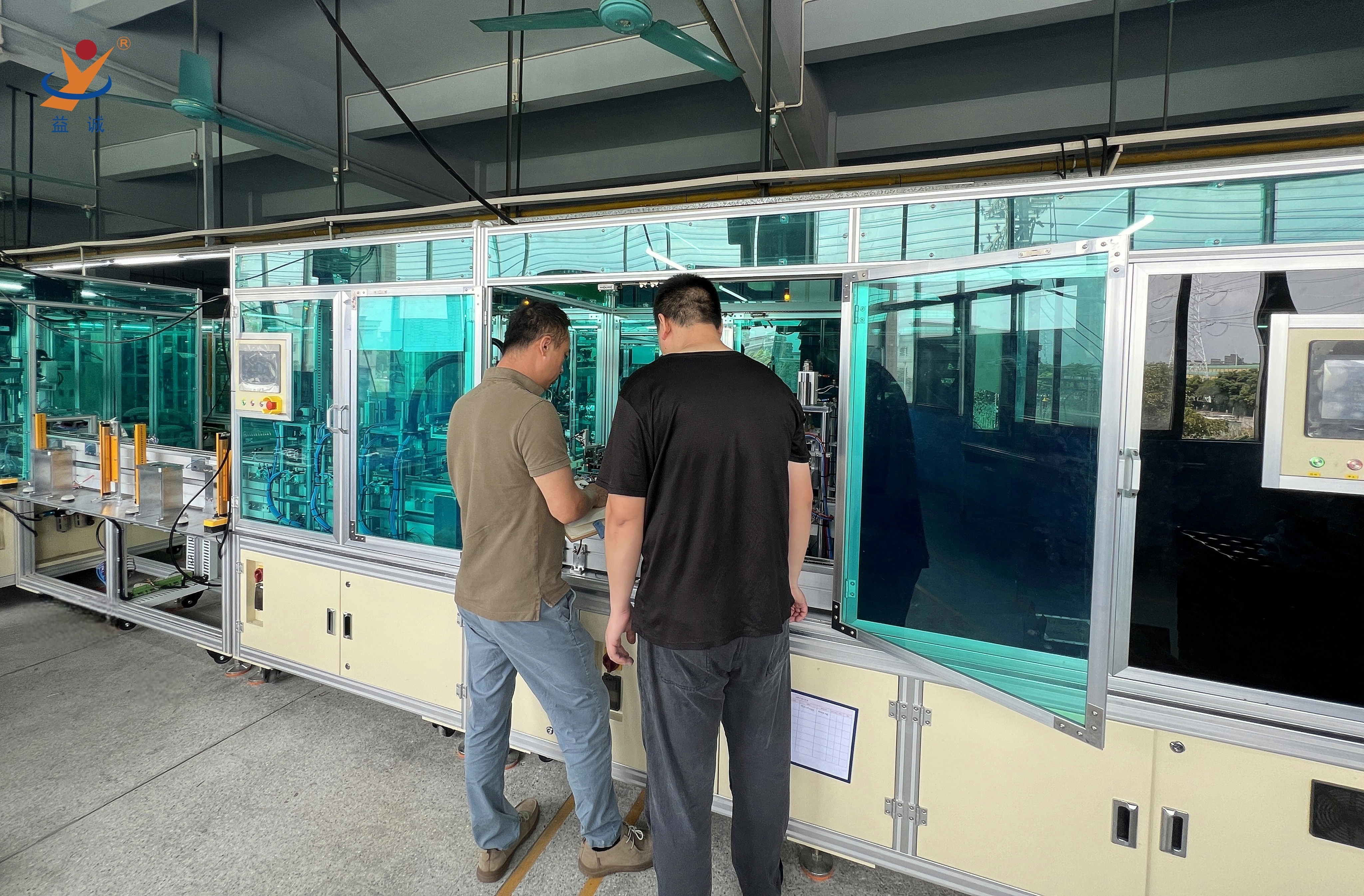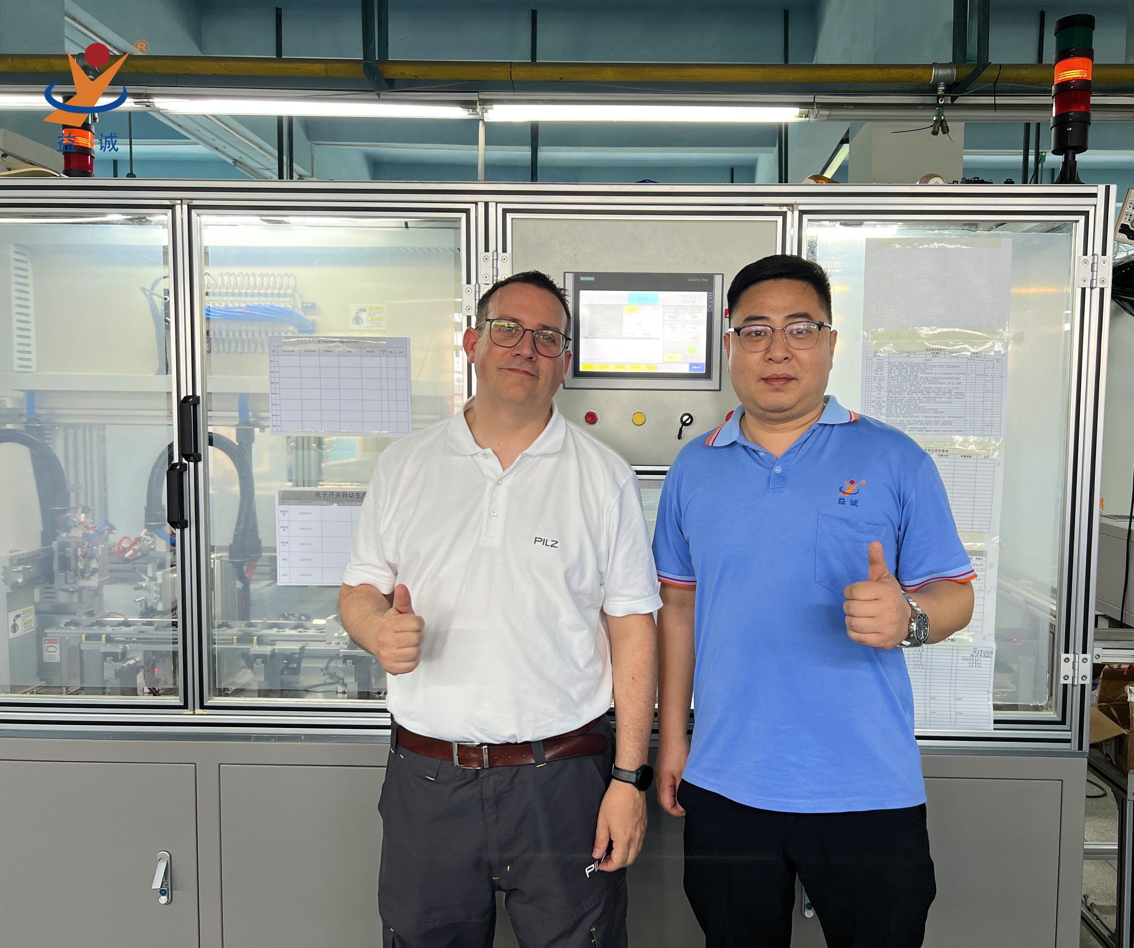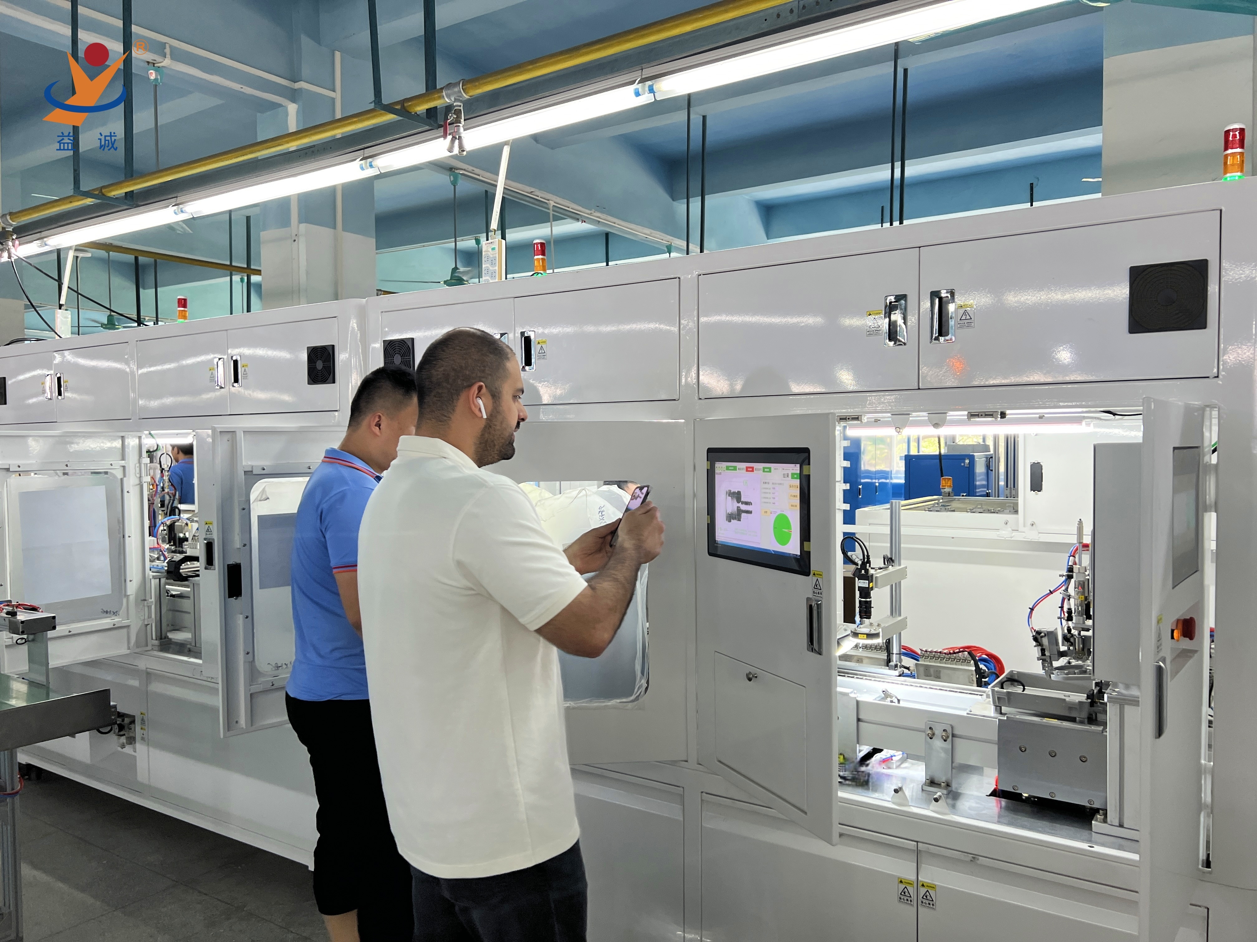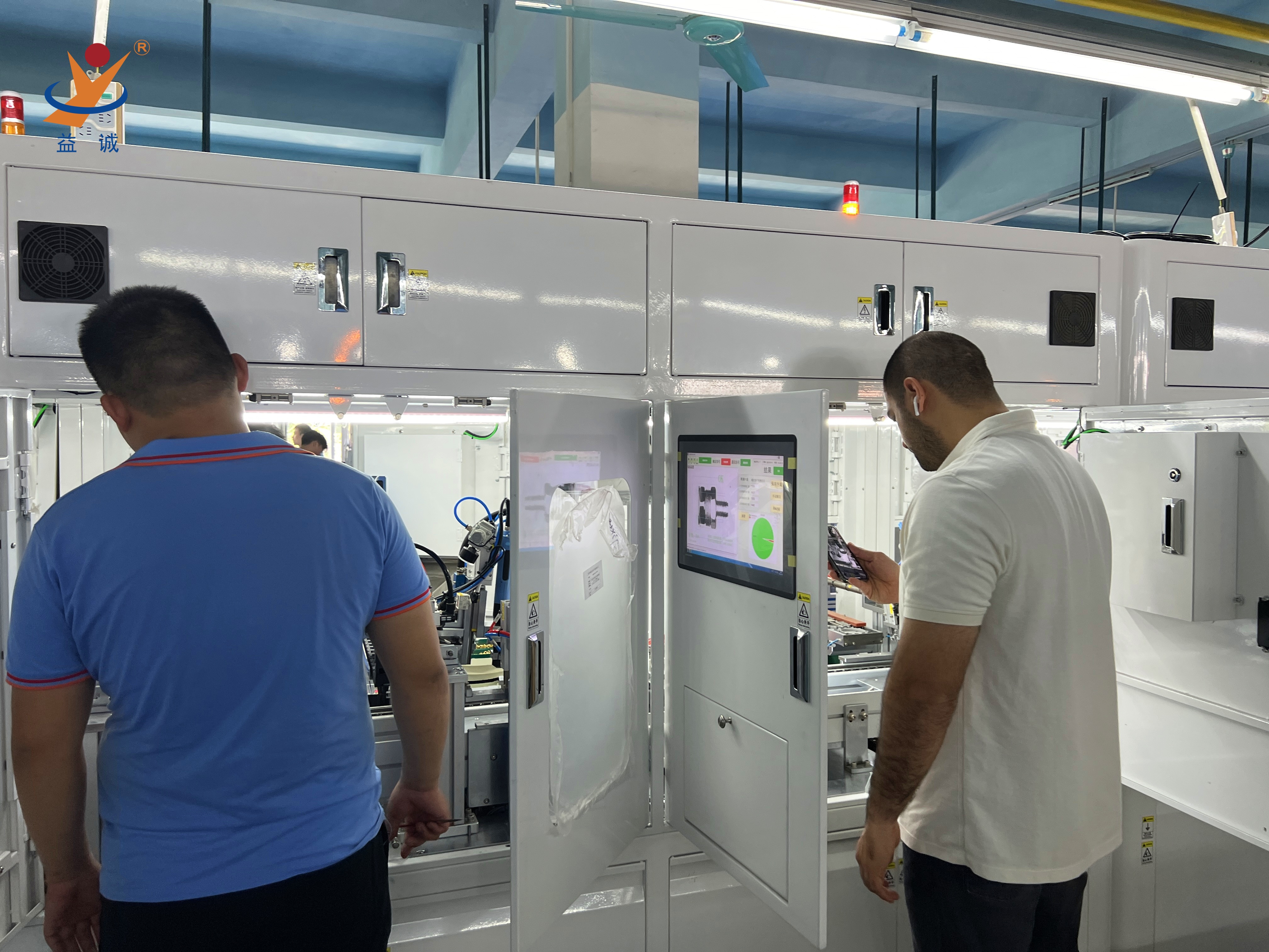 来自法国的客户团队正在现场对高端智能低压电器自动化生产线进行细致地验收,该种类设备是壹号娱乐自动化的实力产品之一,是集合高智能、高精度、高产能与实时数据化检测系统等高端技术于一体的高科技自动化生产线。